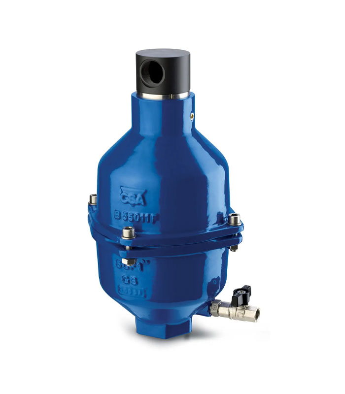 The CSA Mod. SCA 2″ is a high quality compact version single chamber double function combination air valve with a built in anti-water hammer non slam surge prevention system. The air valve allows release of air pockets from pressurized pipelines, and admits large volume of air in the event of pipe draining/burst, to prevent vacuum and negative pressure conditions. The anti–shock mechanism, with adjustable nozzles, will control the air outflow rate thus avoiding fast approaches of water column with potential sudden closures of the mobile block and the risk of water hammer. Entirely made in ductile cast iron, with air release system and seat in stainless steel, SCA 2″ is designed to ensure long lasting and reliable performances also in presence of raw sewage keeping the solids and dirt away from the air release and sealing system.