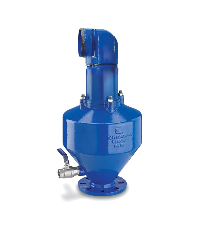 The SCF-RFP-C model is a high-performance single-chamber automatic combination air valve with integrated fast-filling prevention system and threaded outlet for air conveyance. It releases air pockets under pressure during operation and allows the intake of large volumes of air during pipe draining or bursts, preventing the formation of negative pressure. When the air velocity and differential pressure increase too much, the RFP anti-surge disk closes, reducing the outflow and avoiding a sudden closure of the mobile block that would cause water hammer. Entirely made of ductile iron, the valve is designed so that the air release system and the sealing seat are protected from contact with residues and dirt from wastewater and sewage, ensuring long-term performance and reliability.